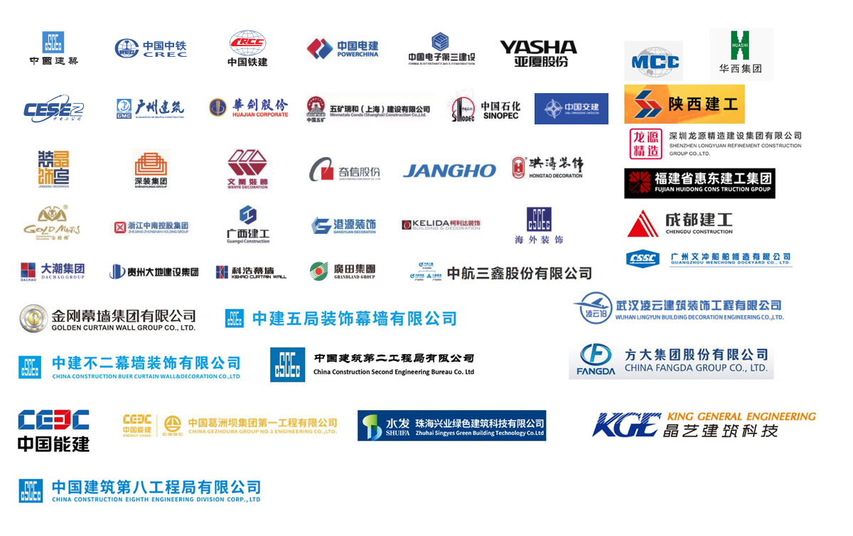 公司參建了諸多大型項(xiàng)目工程,如港珠澳大橋、珠海國際航展、深圳國際會展中心、廣州白云機(jī)場、西安全運(yùn)會場館、成都東安湖大運(yùn)會場館、樂山奧體中心、洛陽奧體中心、增城富士康廠房、惠州中海油、陽江核電站、珠三角各地鐵線、高鐵站、廣西桂林機(jī)場、廣西柳州文化廣場、四川成都天府機(jī)場、海南海口美蘭機(jī)場、西安絲路會展中心、惠州北站等等。與中國建筑、中國中鐵、中國鐵建、中國電建、中國交建、中國中冶、中國能建、廣東建筑、廣西建工、廣州建筑等大型國有企業(yè)下屬公司及江河幕墻、金螳螂裝飾等各大建筑裝飾、幕墻裝飾公司達(dá)成長期友好合作關(guān)系。
